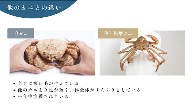 このほか、カニの旬は冬が多いですが、毛ガニは一年中漁獲されている点も、他のカニとの大きな違いです。