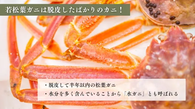 若松葉ガニとは、脱皮して半年以内の松葉ガニのことです。通常の松葉ガニと見た目の大きさはほぼ同じですが、身入りは8割程度。殻が柔らかく手で簡単に割れるため食べやすいのが特徴です。また、脱皮したてで殻と身の間に隙間があり、そこに海水が多く入るため通常の松葉ガニよりも塩味を強く感じます。